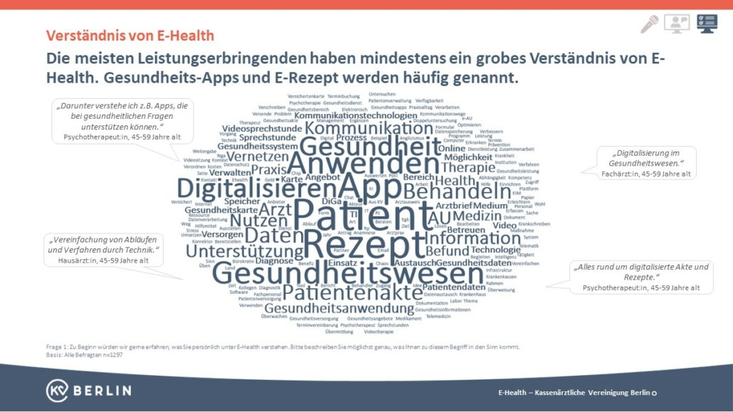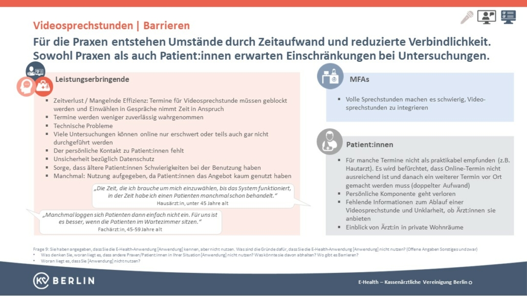 • Stufe 2: Qualitative Online-Tiefeninterviews mit insgesamt 40 Leistungserbringenden, Medizinischen Fachangestellten und Patient:innen aus Berlin, um alle Sichtweisen einzufangen
