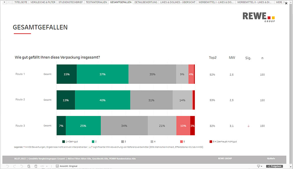 Zudem war der Standardisierungsgrad trotz wiederkehrender Fragestellungen, z.B. im Rahmen von Verpackungs- oder Handzetteltests, gering. Interne Abstimmungen, Studien-Setup und Reporting kosteten auch bei sich wiederholenden Fragestellungen zu viel Zeit und es gab keine verlässlichen Benchmarks zur Einordnung der Ergebnisse.