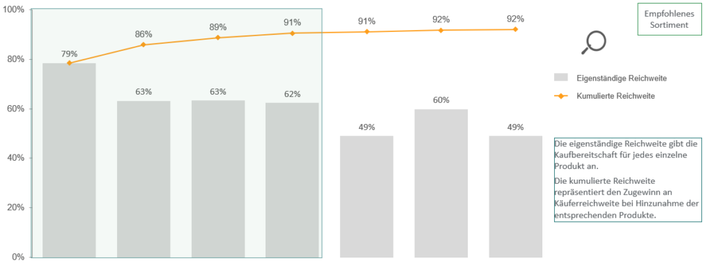 • Vergleich von unterschiedlichen Sortimentsvorgaben und -größen hinsichtlich der zu erwartenden Marktabdeckung.