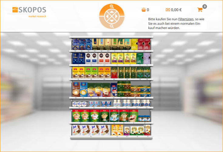 • Visuelle Testung der von Melitta entwickelten potenziellen Sortimentsszenarien im Wettbewerbsumfeld via SKOPOS SHELF: Einkaufsaufgabe ‚typischer Einkauf von Filtertüten‘ mit Auswahl relevanter Produkte und entsprechender Stückzahl