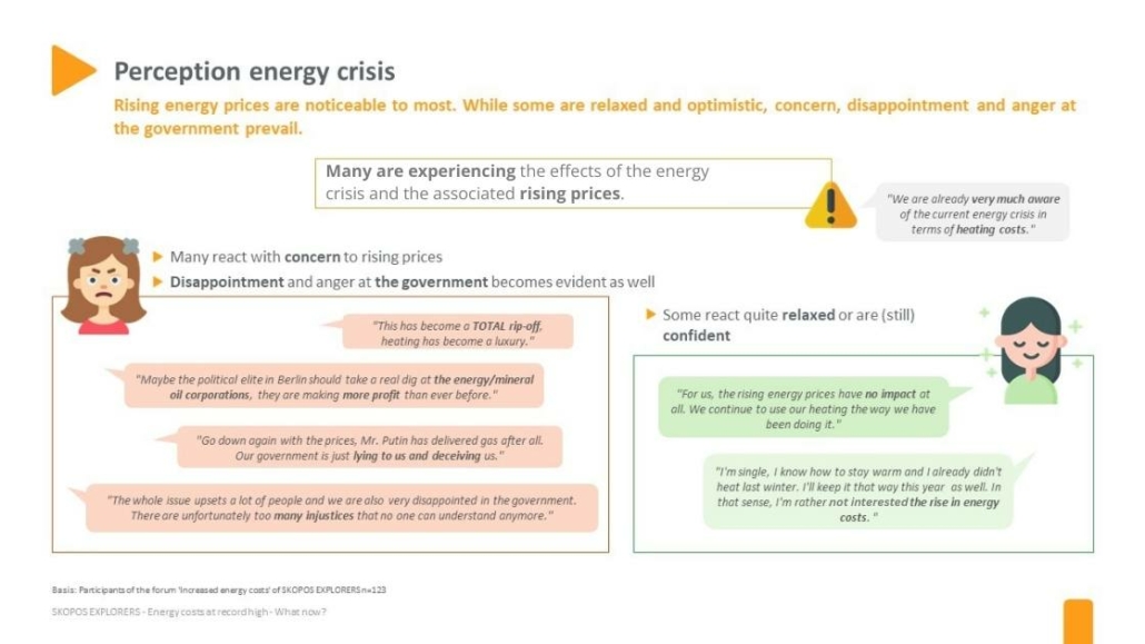 Because one thing is certain: the rising energy prices are clearly noticeable for most people. While some react in a relaxed and optimistic manner, concern, disappointment and, in some cases, anger at the government predominate. Fears and anxieties are mainly expressed in relation to personal effects, such as the upcoming utility bills. But Germans are also concerned about energy shortages in general and potential social discord.
