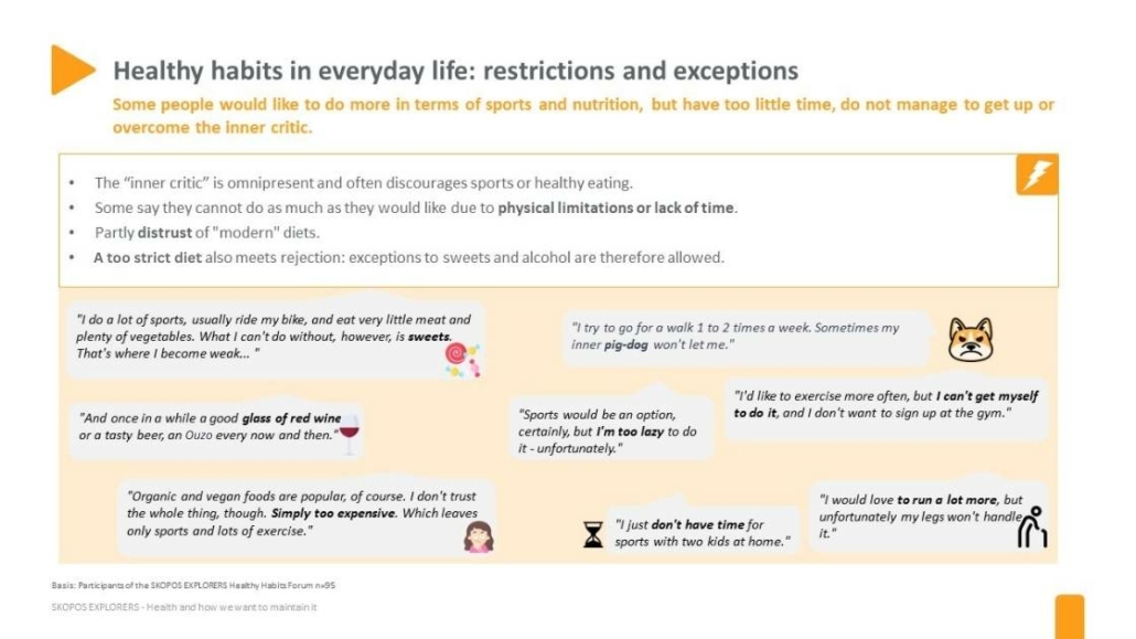 We asked our in-house SKOPOS qualitative community, the SKOPOS EXPLORERS, what health means to them, what is relevant for a healthy lifestyle and what can be integrated into everyday life. For the majority of participants, a holistic health concept consists of a balanced diet, plenty of exercise and sport, and sufficient sleep. But it also includes the mental aspect in the form of a healthy mind. Healthier lifestyles focus primarily on nutrition and sports and are actively integrated into everyday life. Some participants cite specific triggers for this, such as an urgent illness or the fear of it.