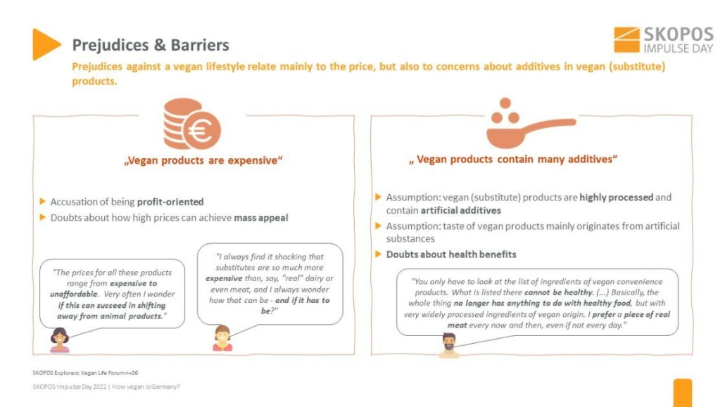 The prejudices against a vegan lifestyle mainly relate to the price, but also to concerns about artificial additives in vegan (substitute) products. Some respondents accuse companies of offering vegan products purely for profit or for image reasons. Others assume that the companies are afraid of losing market share. In addition, there are doubts as to whether the mass suitability of vegan products can succeed due to the high prices.