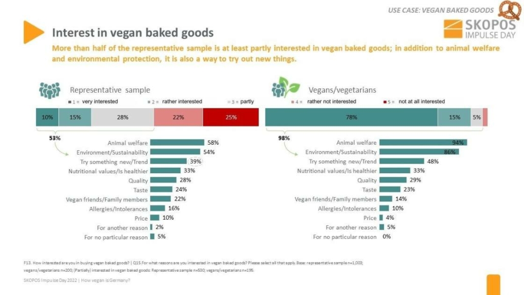 Together with SKOPOS, the animal rights organization PETA has published the results of a population-representative quantitative survey in Germany on the topic of vegan baked goods. For this purpose, we interviewed around 1,000 consumers in January of this year and also conducted an in-depth survey of 100 vegans and vegetarians. We also supplemented the results of the quantitative study for PETA with insights from our own community, the SKOPOS EXPLORERS.