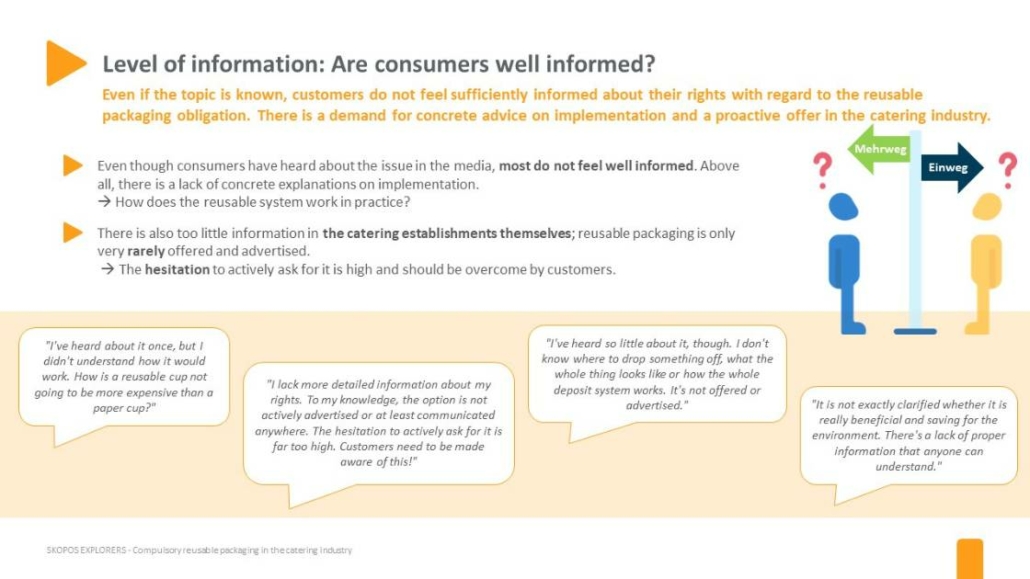 The majority of respondents has heard about the mandatory reusable packaging in the catering industry through the media. However, only a few have encountered it in everyday practice. Even if the topic is known, customers do not feel sufficiently informed about their rights regarding the reusable packaging obligation. Concrete advice on implementation and a proactive offer in the catering trade are called for. The respondents also make further suggestions on the subject: disposable packaging should be environmentally friendly, bringing your own packaging should be permitted, and the reusable system should be standardized.