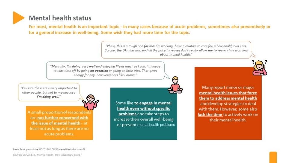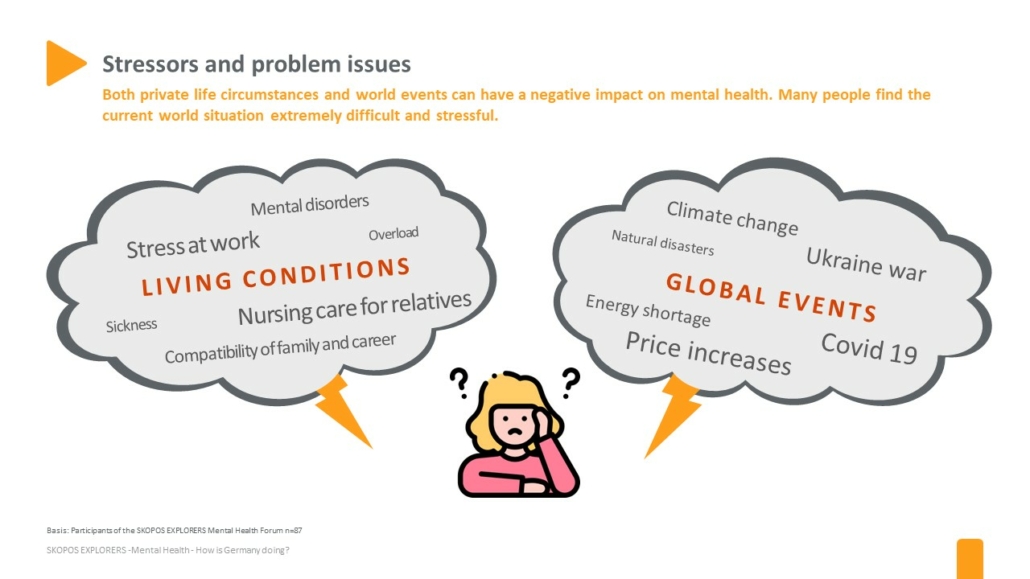 It is clear how important the topic of “mental health” is for the participants: A large proportion of respondents name a number of mental stresses that force them to address the issue of mental health. Even among the participants who do not name any acute problems, many deal with their mental health in order to prevent problems or to increase their general well-being.